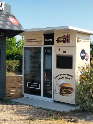 Ce distributeur automatique de burgers vient compléter l'offre existante de pizzas de notre client. Grâce à sa colonne de four intégrée, les burgers peuvent être réchauffés en quelques secondes seulement, garantissant une dégustation rapide.